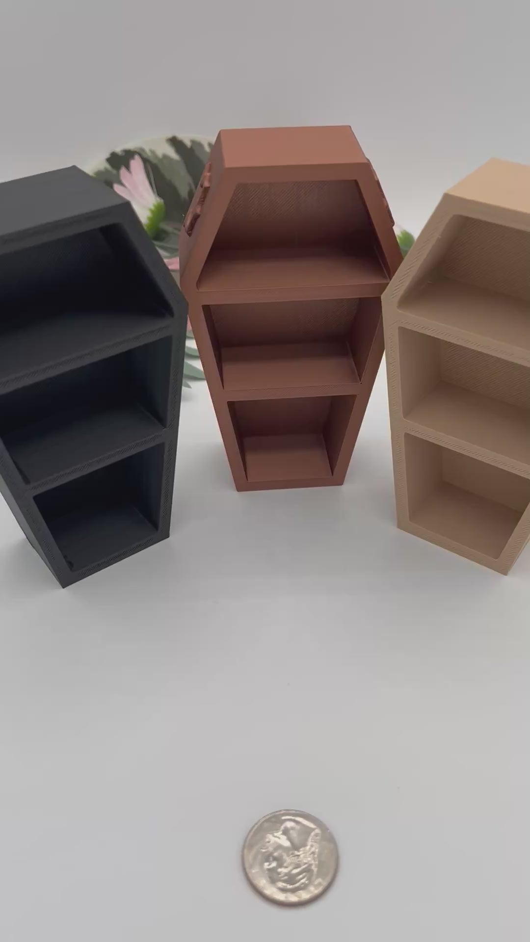 Build your own miniature set! We finally have our custom 3D coffins available for sale to put together your own miniature design. They well in any miniature scale village, doll house, or even a gaming set. They are about 5 inches tall, 3 inches wide, and 1 inch deep. The shelves are the shelves are 1 inch apart. They also come in the colors available.