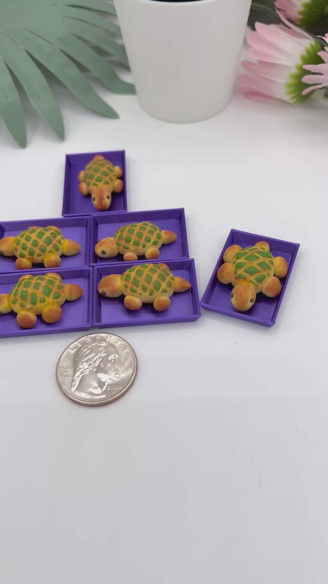 These miniature turtle breads are handmade out of polymer clay and painted to look like real baked bread. The top is coated with a green color. This resembles melonpan and perfect for doll house collectors or miniature collectors. They fit in well with miniature kitchens, dining tables, and even nooks. The turtles are about 1.25 inches front head to tail and .75 of an inch wide. Very lightweight.