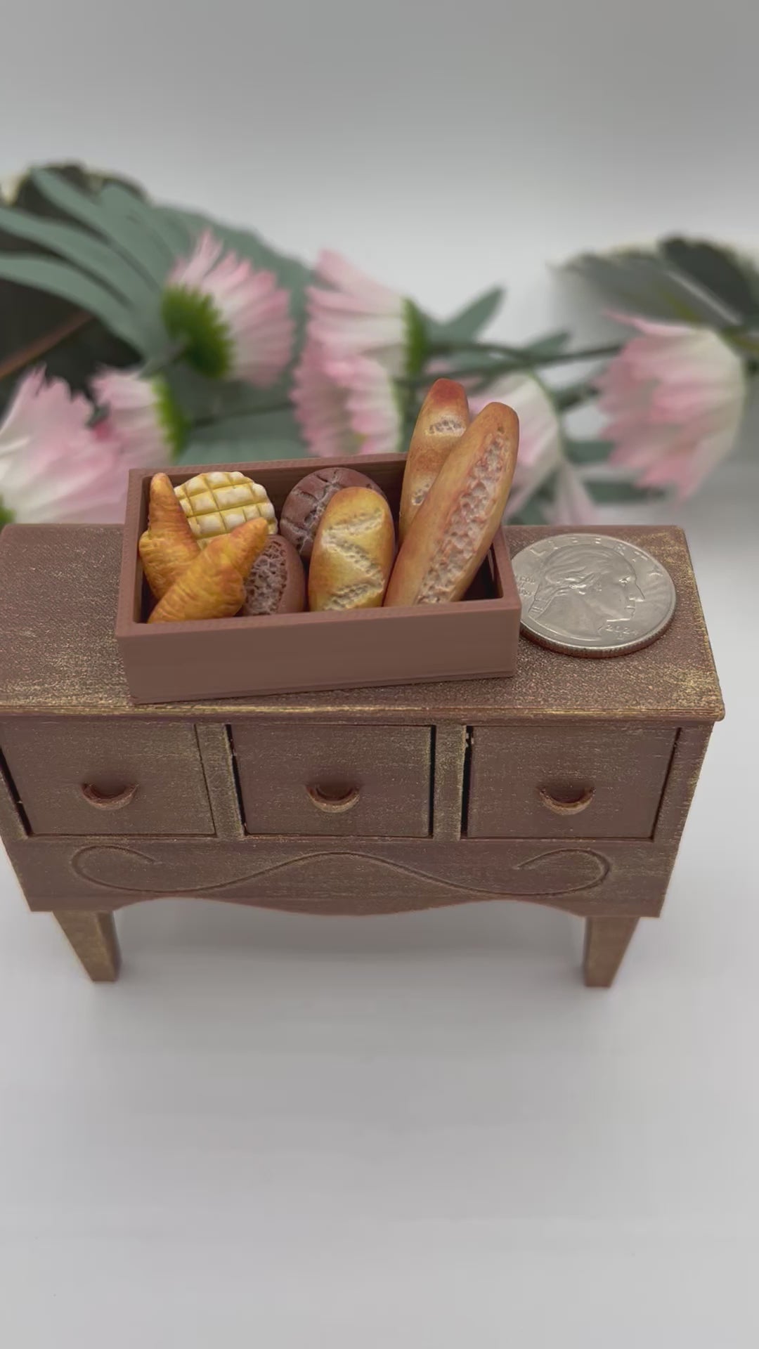 This miniature bakery basket is filled with 8 different kinds of breads. Each piece is handmade out of polymer clay. The basket comes with 2 different baguettes, 2 croissants, 1 melonpan, 1 round brown bread, 1 white loaf, and 1 brown loaf. Again this comes with the square, brown basket, which is also created on our studio. The basket is 2 inches long by 1 inch wide and 1/2 an inch tall. The baguettes are about 1 1/2 inches long. Other pieces are about 1/2 an inch around or less.