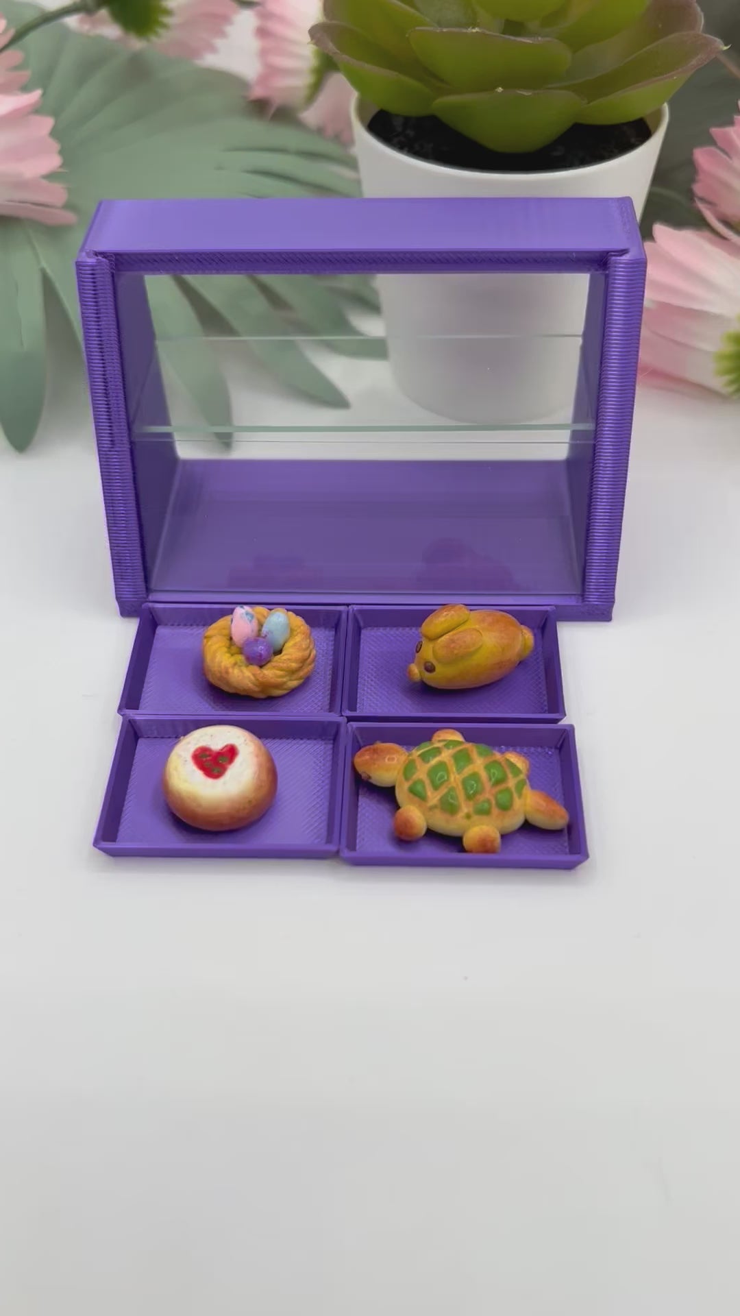 These miniature pastry cases contain handmade polymer clay food, and all items are designed by us. There are 4 mini trays filled with a handmade turtle, bread bird nest, bread bunny, and a tomato heart bread bowl. The pastry case is purple as shown in the photo with matching trays. The case is 3.25 inches long, 2 inches tall and about 1.25 inches wide. The is an entire set as shown.