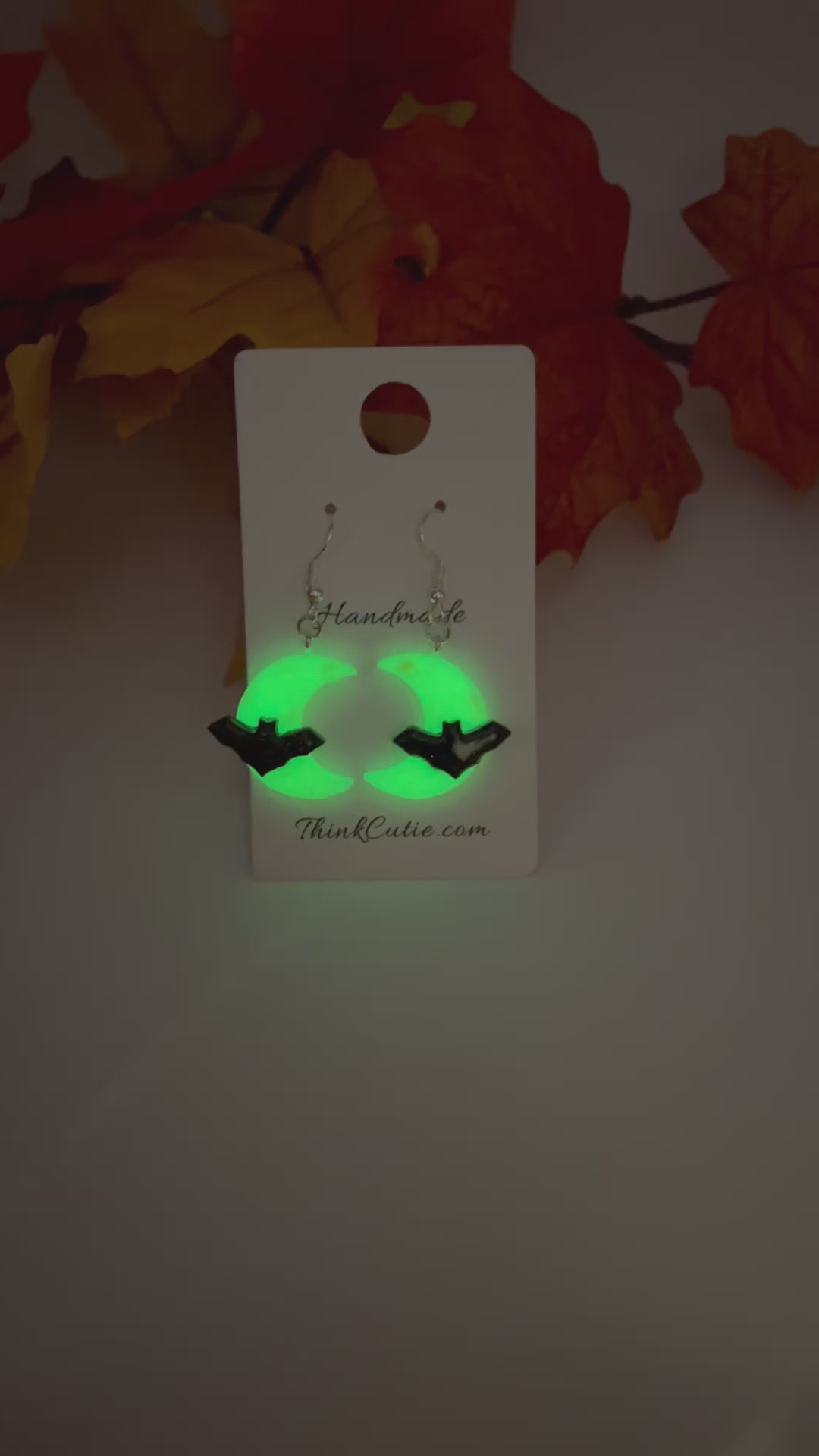 These bat and moon earrings were handmade out of polymer clay and the moon is made out of glow in the dark clay. There is a light dusting of gold shimmer on the moon and light glitter in the bats. They are very lightweight and can be worn during any season night or day. For the best glow in the dark effect, leave in the sunlight or under a bright light for 15 minutes. The earrings are about 1 inch wide by 1 inch tall.