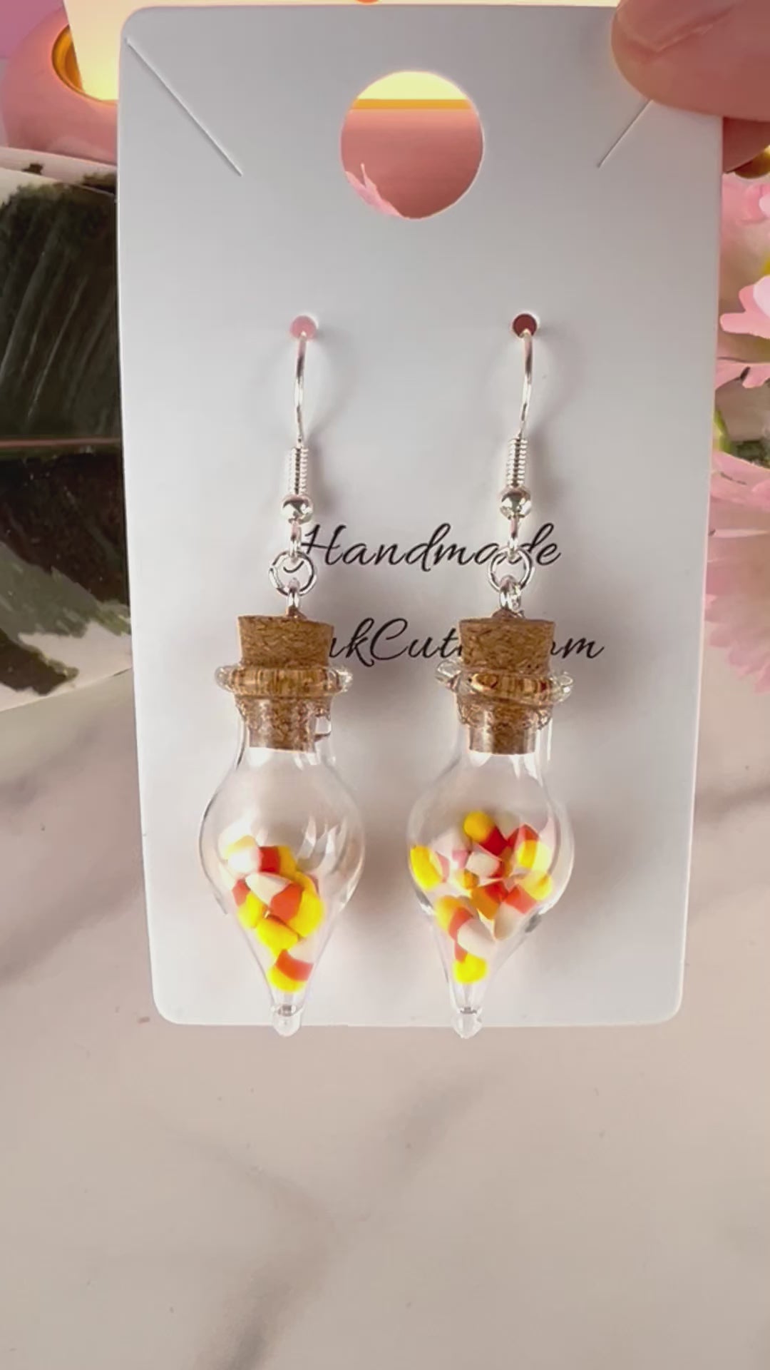 These glass teardrops are filled with handmade miniature candy corns. The candy corns are about a 1/4 inch long and a few millimeters wide. The corks are glued closed and sterling silver (hypoallergenic) earring hooks were added with earring backs. The glass teardrops are 1.5 inches long and .5 inches wide, with the earrings hooks the total length is 2 inches.