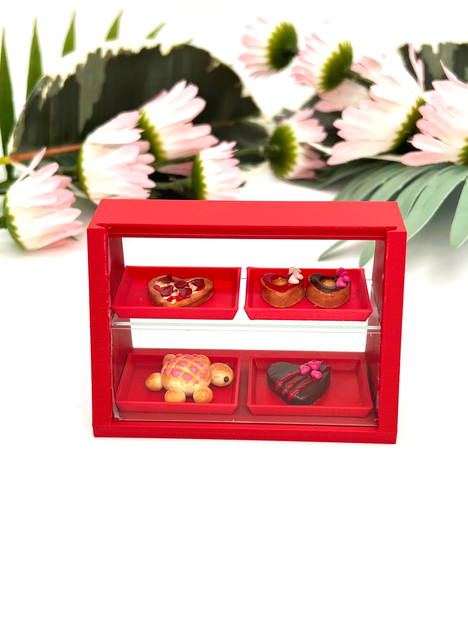 This miniature pastry case is all things hearts for the month of February and is perfect for miniature collectors. Each miniature food piece on the trays is handmade out of polymer clay and ranges from 1/2 an inch to 3/4 of an inch. There is one turtle bread, 2 heart donuts, 1 heart pizza, and 1 chocolate heart cake with red frosting decorations and pink hearts. The pastry case has real glass and was custom designed and 3D printed with the red trays in our studio. The case is 3.25 inches long and tall and is 1.5 of an inch deep.