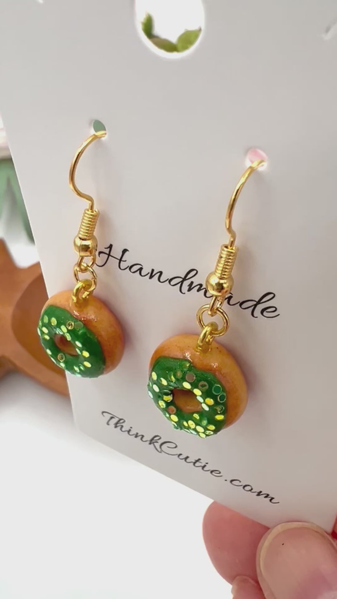 These handmade miniature donut earrings have green frosting and a green & gold glitter. They are perfect for St. Patrick’s Day or Spring. They are also very lightweight and are about 1/2 an inch around. They are hypoallergenic.
