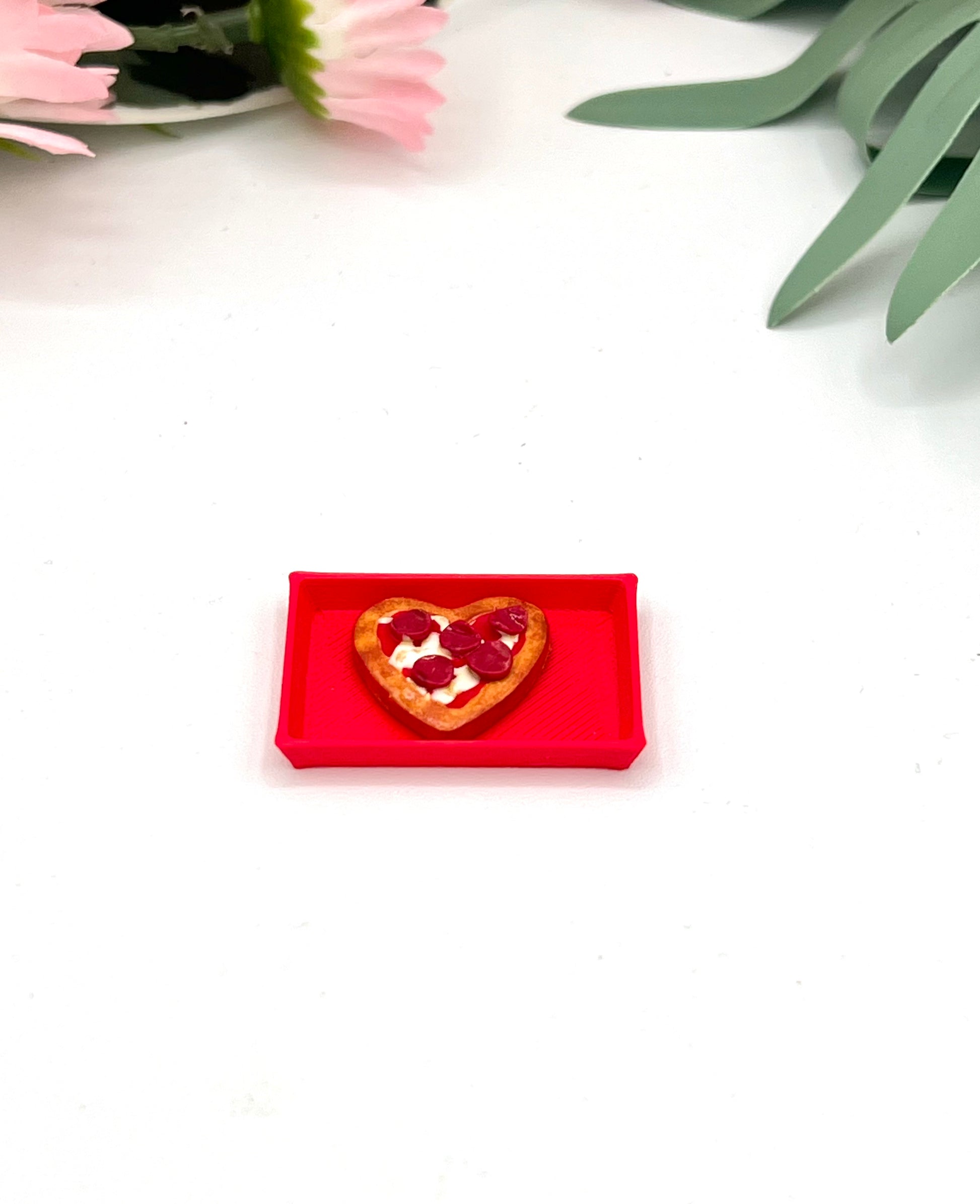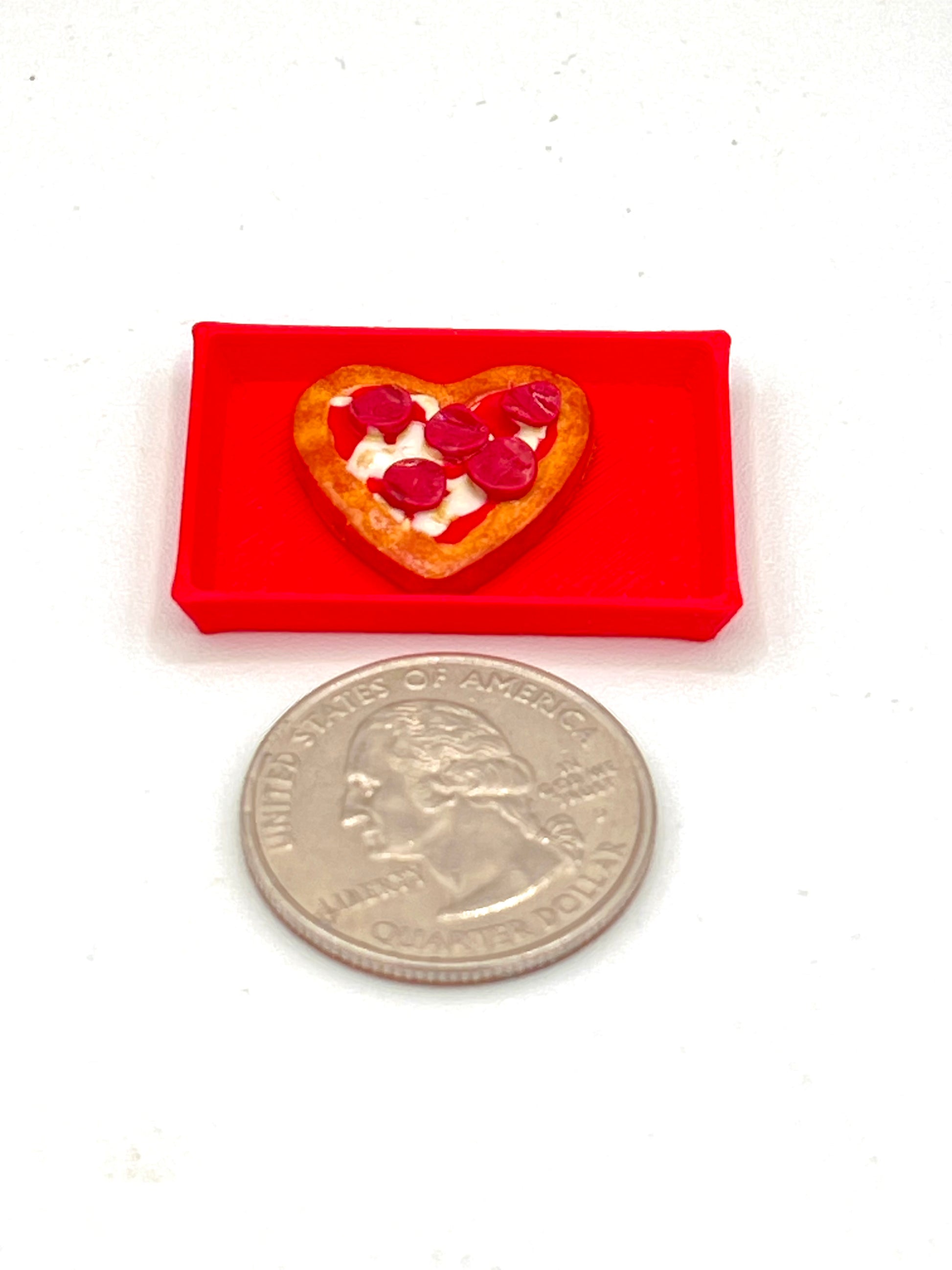 This miniature pepperoni heart pizza is perfect for decorating your miniature kitchen set. This comes with the red tray and is 1:12 scale. The pizza is only .75 of an inch tall and wide. The tray is 1.25 inches wide by 1 inch tall. The pizza was handmade out of polymer clay and the tray was 3D designed and printed.