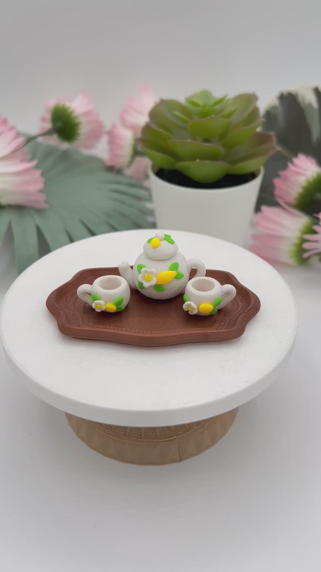 This tiny tea set is handmade in white polymer clay and decorated with a citrus theme. There are little lemons, leaves, and white flower blossoms on the outside of the tea pot and cups. The tea pot is 1.25 inches long and 1 inch tall. The cups are about .5 of an inch tall and wide. They come with the 3D platter shown in the picture and is also created in our studio.