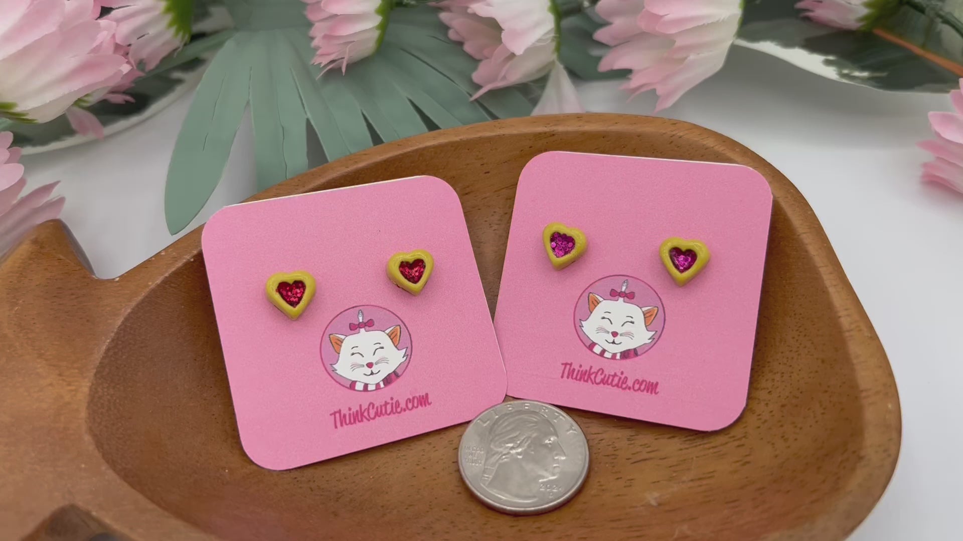 These miniature red heart cookies studs are handmade out of polymer clay. The center is filled with a glittery red and the surrounding cookie is made out of a tan or cookie colored clay. The studs are only 1/4 an inch tall and wide. They are perfect for the month of February and those who love pastries.