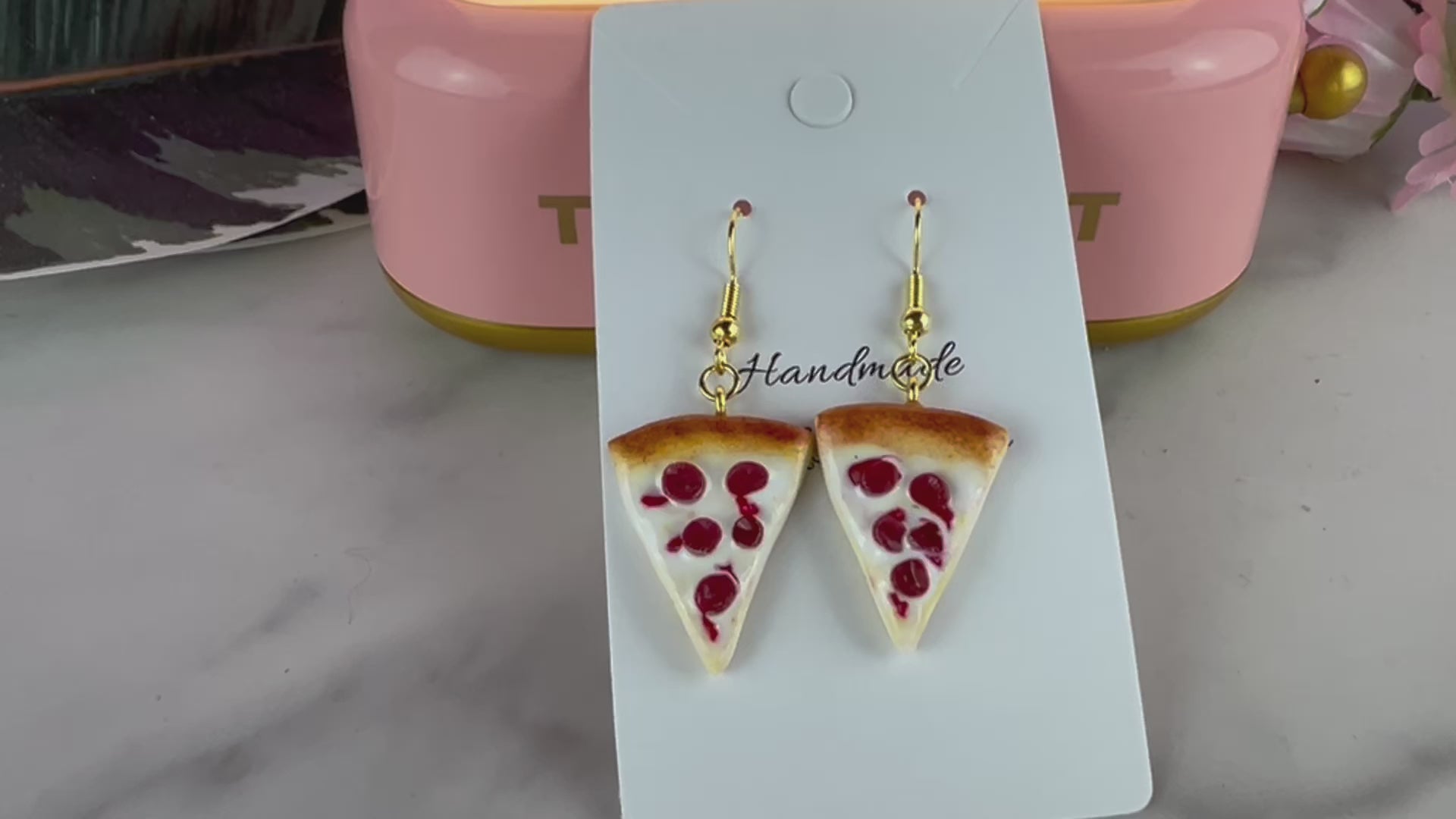 These food themed earrings are handmade pepperoni earrings for any food lover or for someone who works in the food industry. They also make the perfect party apparel that adds something unique. Each pizza is about .75 inches in height and .5 inches wide. They are very light weight and finished with gold color earrings hooks that are hypoallergenic.