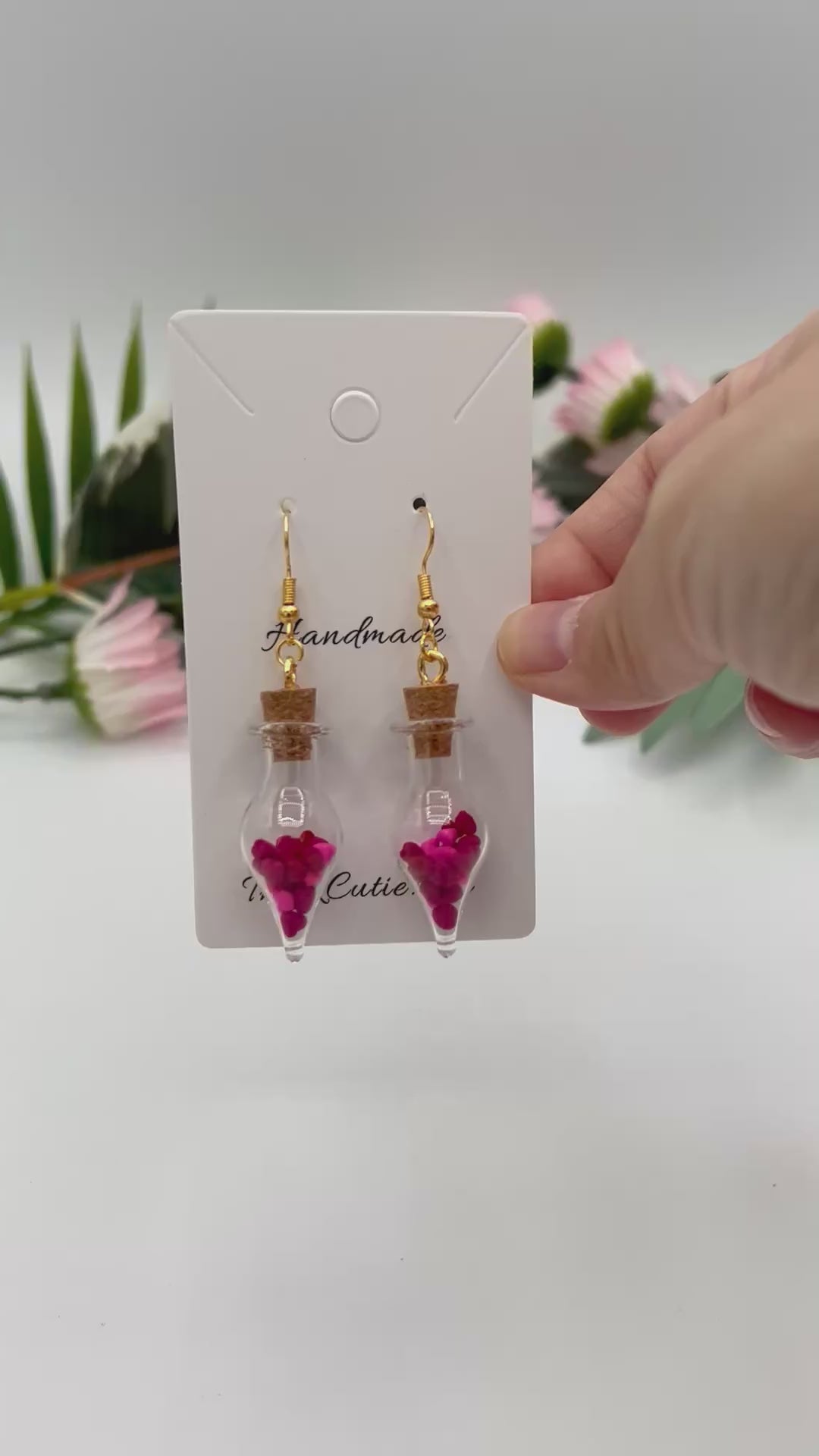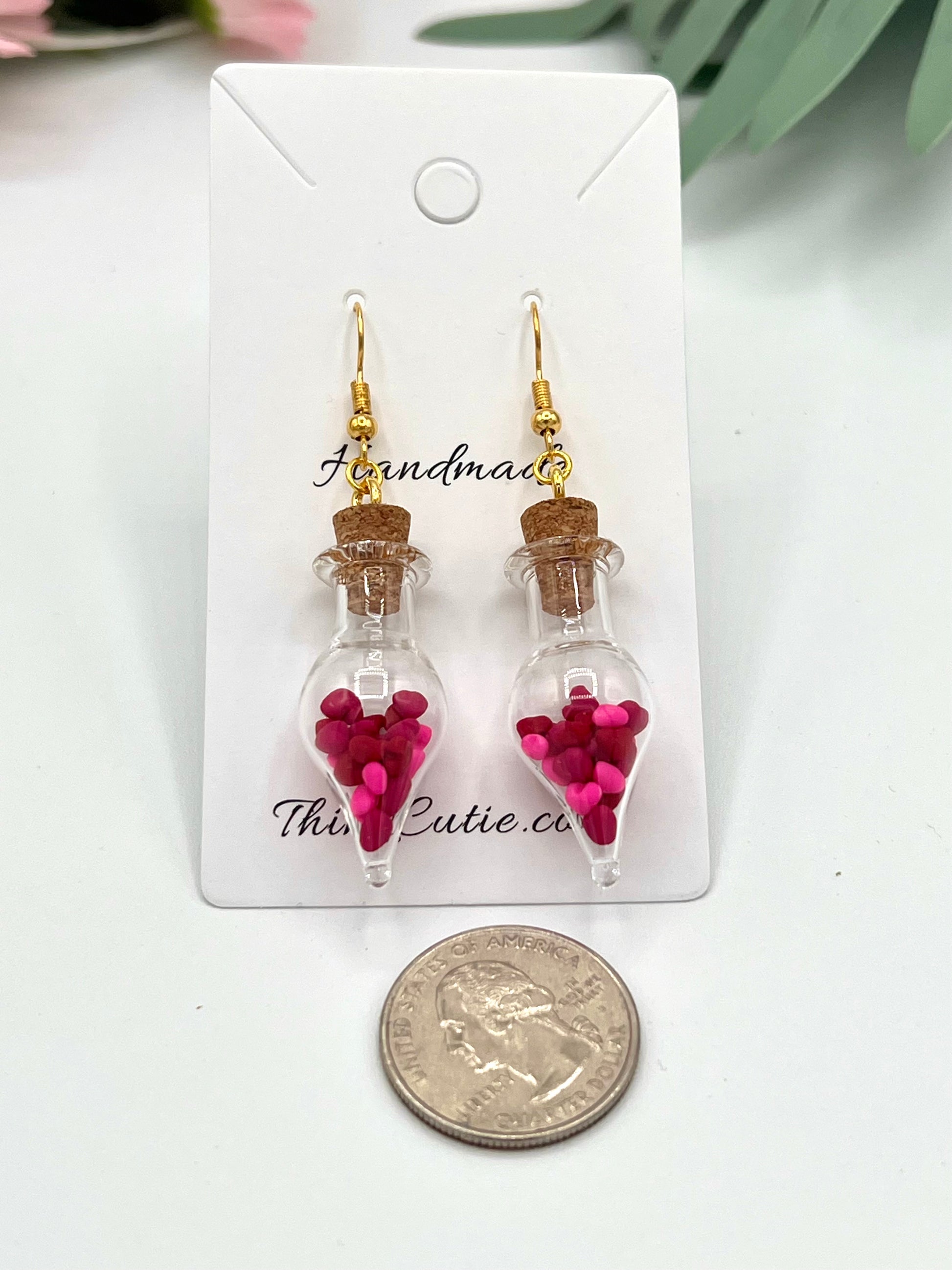 These tiny hearts are handmade out of polymer clay and placed inside a glass tear drop. There are red, pink, and dark pink hearts. Each tear drop is 1.5 inches long and .5 inches wide.
