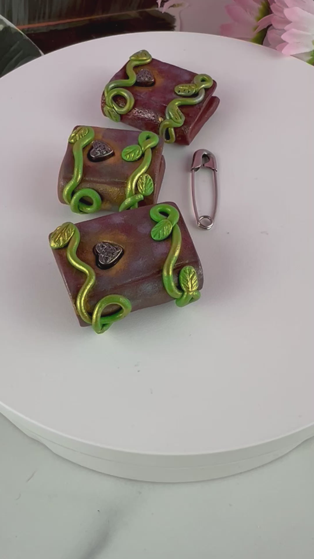 These miniature books are about 1 inch wide and 3/4 an inch tall. Each book is handmade out of red-brown polymer clay and dusted with gold powder. Sizes may vary because they handmade. The white clay is scored to look like real pages. The books fit in any miniature collection. The heart in the book is a antique gold or silver Celtic knot.