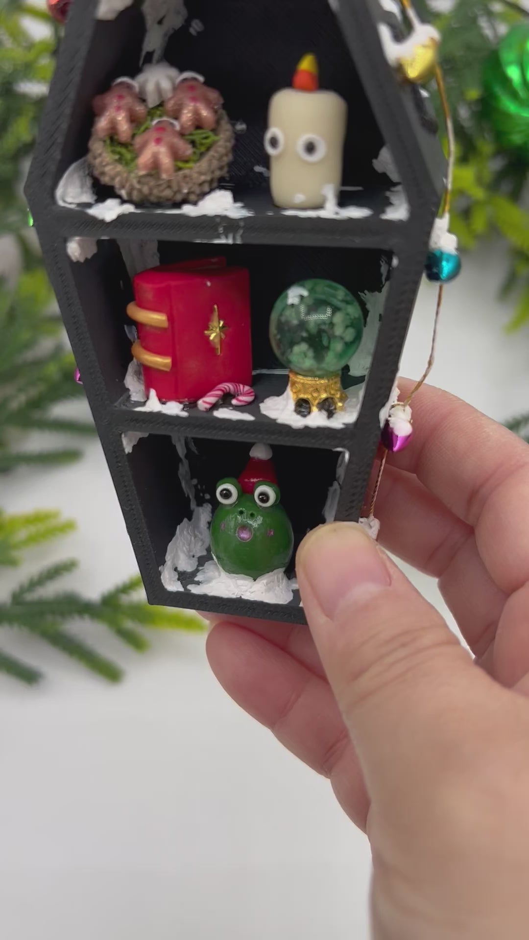This miniature frog Christmas coffin is filled handmade clay miniatures and is one of a kind. All the handmade pieces are as shown in the photo. The frog is handmade out of polymer clay with the book, gingerbreads, and candle (glow-in-the-dark clay). The crystal ball has glow in the dark flecks. The coffin was designed and made in our studio and is 4 inches tall by about 2.25 inches wide and 1 inch deep. The glow in the dark pieces are best if placed under a bright light for 15 minutes or more (not direct sunlight or heat lamps).