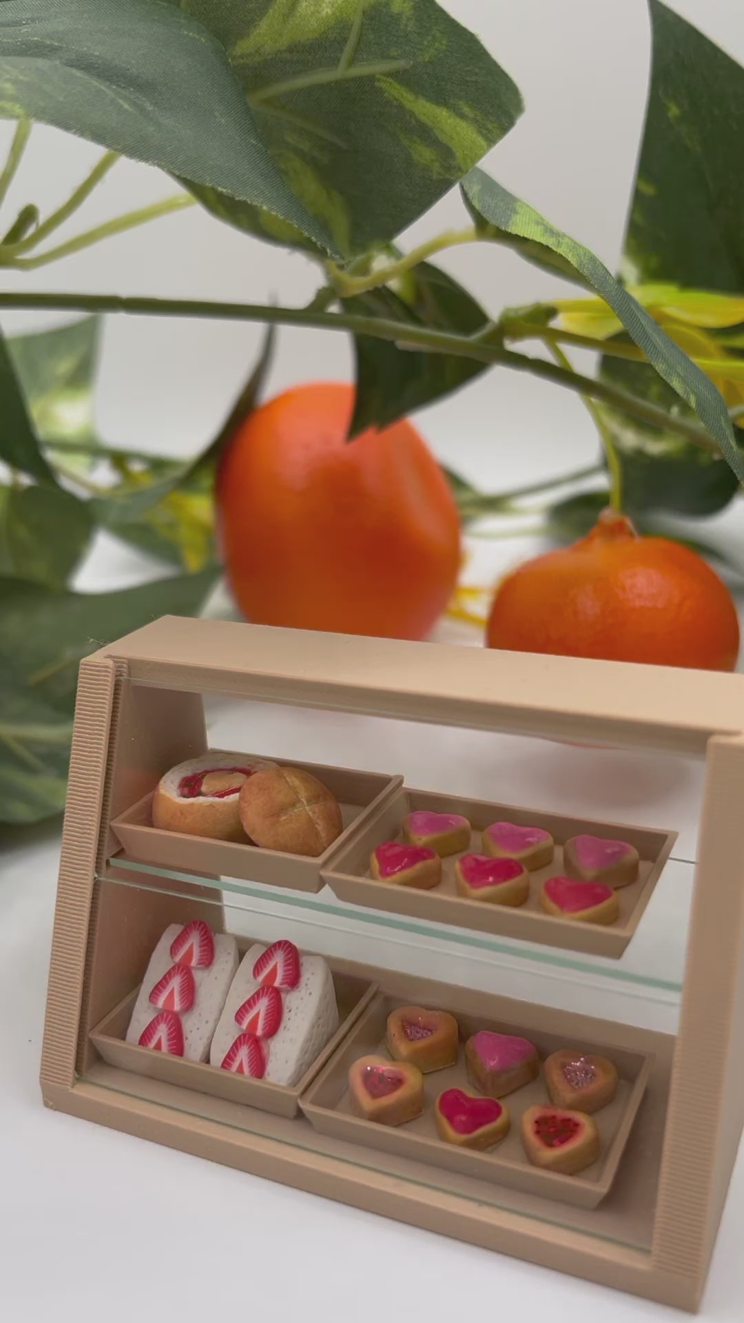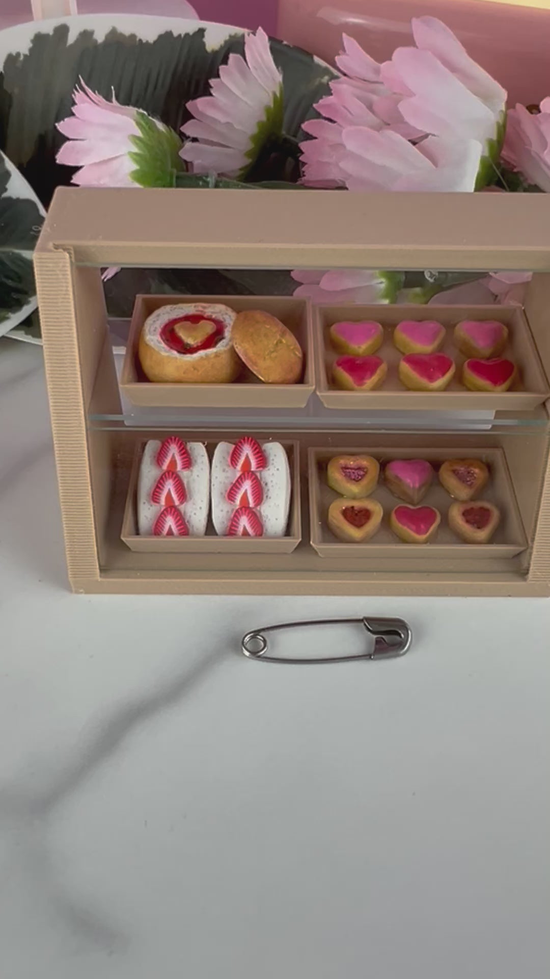 This miniature pastry case was 3D printed and designed in our studio. It’s filled with miniature polymer clay foods about 1/2 an inch wide and tall. The pastry case is 3 inches long and 2.5 inches tall. Each case comes with 2 strawberry sandwiches, 1 tomato soup bread bowl and top, 1 set of frosted heart cookies, 1 set of glittery heart cookies. The trays are included. The heart cookies are the only minis glued to the trays.
