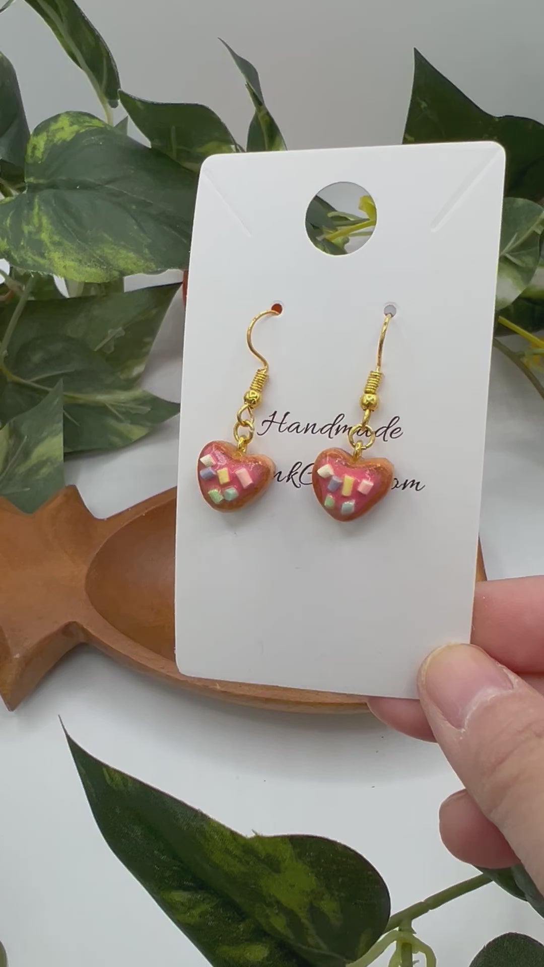 These mini heart earrings are handmade out of polymer clay. They are frosted pink and have pastel sprinkles. They are only 1/2 an inch wide and 1/2 an inch tall.