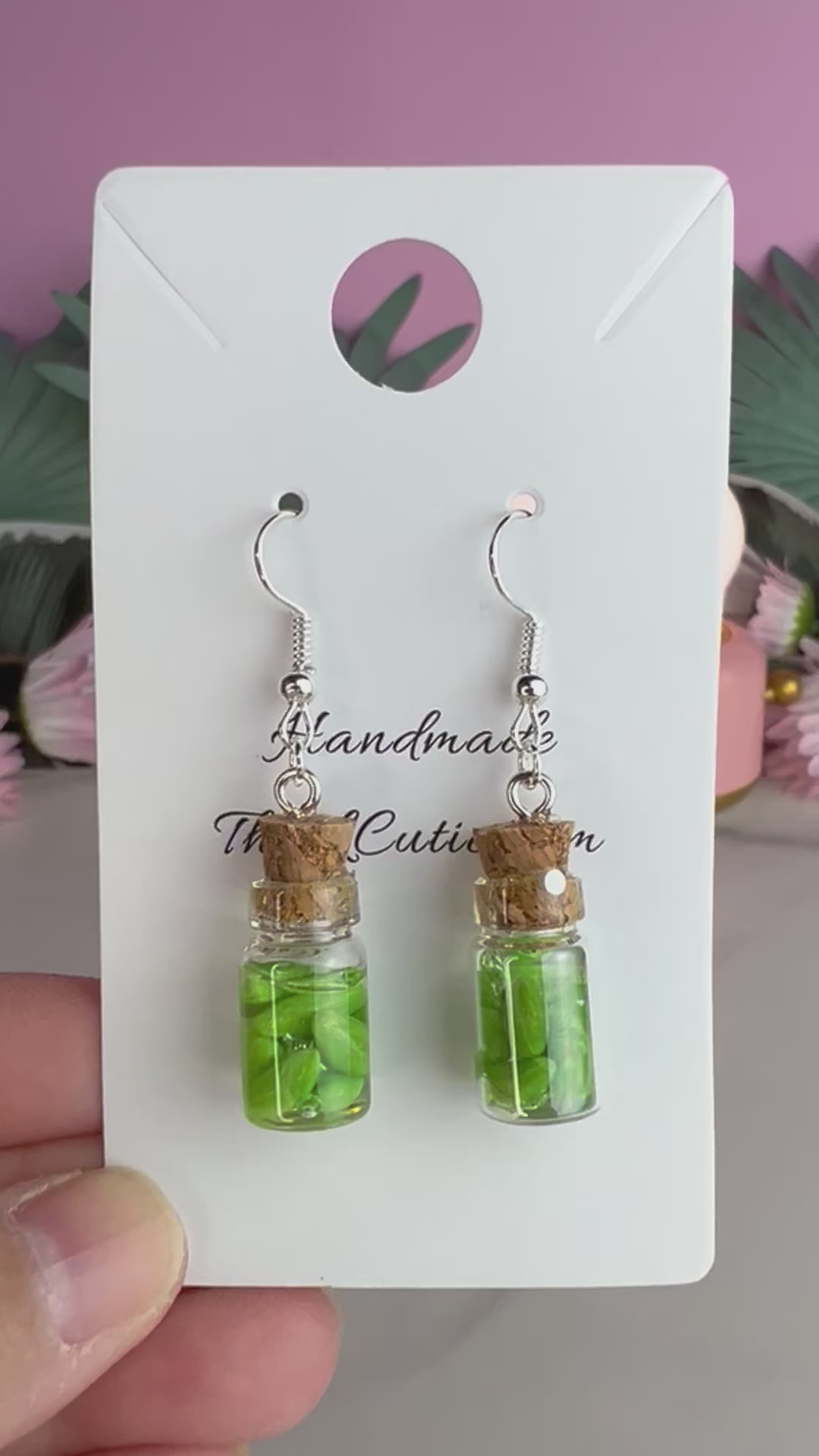 Another Minnesotan favorite are these handmade mini pickles in a jar. The minis are handmade out of polymer clay and are placed inside tiny glass jars. They are 1/4 of an inch wide by 1/2 an inch tall. They also dangle about 3/4 of an inch long from the ear.