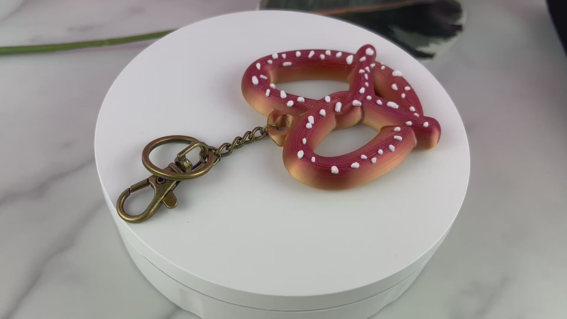 This is our cute salted pretzel design! Perfect for hanging on your backpack, purse, or favorite spot in your home. It is 3d printed in 2 colors. The pretzel you receive may vary slightly in color gradient.